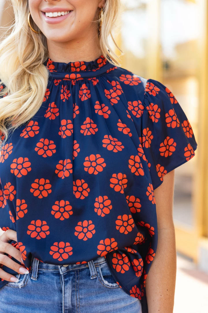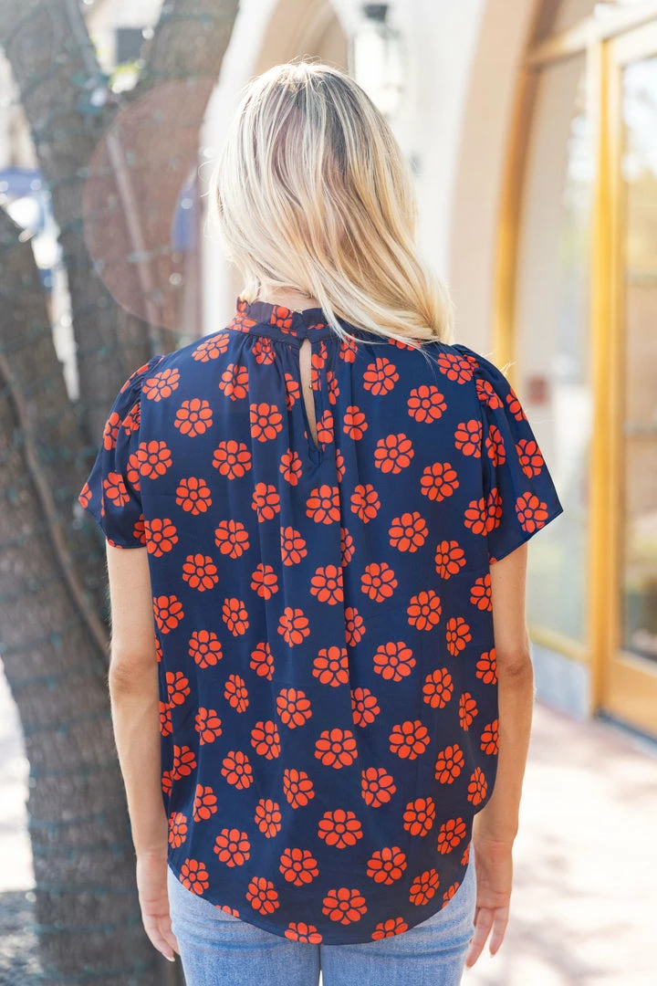 Sophisticated and chic! Our Meredith Top by THML is constructed of a lightweight, silky fabrication, with and a ruffle gathered neckline and flutter sleeves that are oh so flattering. The navy and orange print is so on trend and perfect to transition with into Fall. Pair with white or light wash denim and wedges for those upcoming game days or lunch with the girls, and transition to dark wash and booties for your next date night.