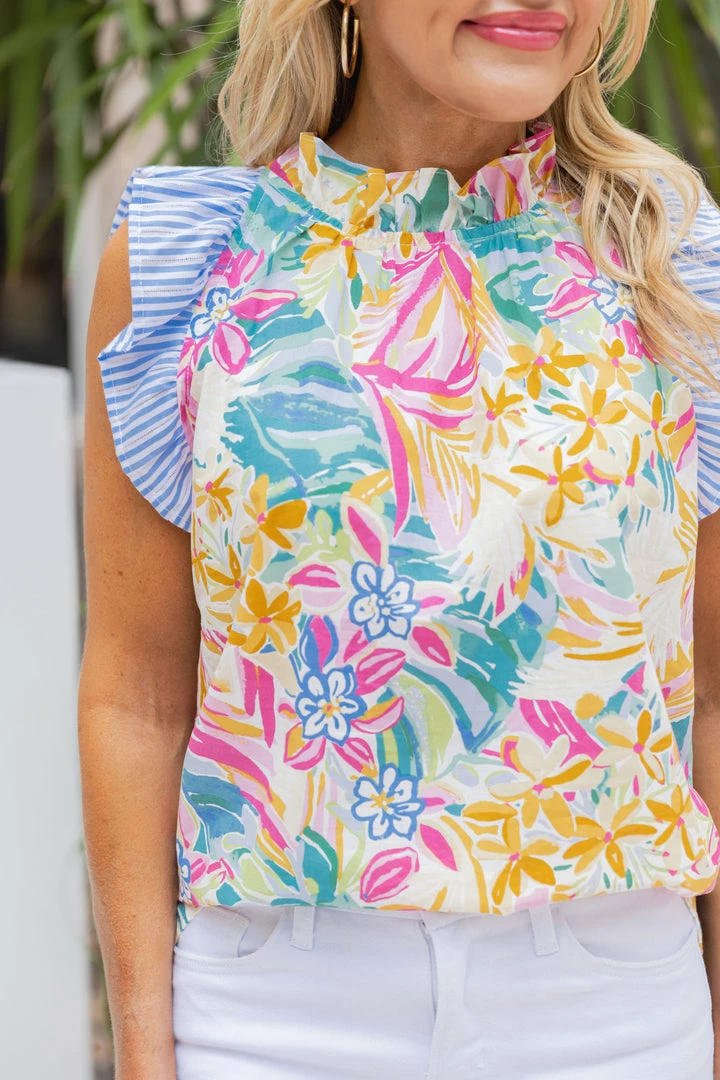 How fun are the mixed prints on this piece?! Our Tanya Top by THML is constructed with a lightweight fabrication and flutter sleeves for a flowy and chic look. Pair with white denim and wedges to take you from brunch, shopping, and everything in between this season!Â